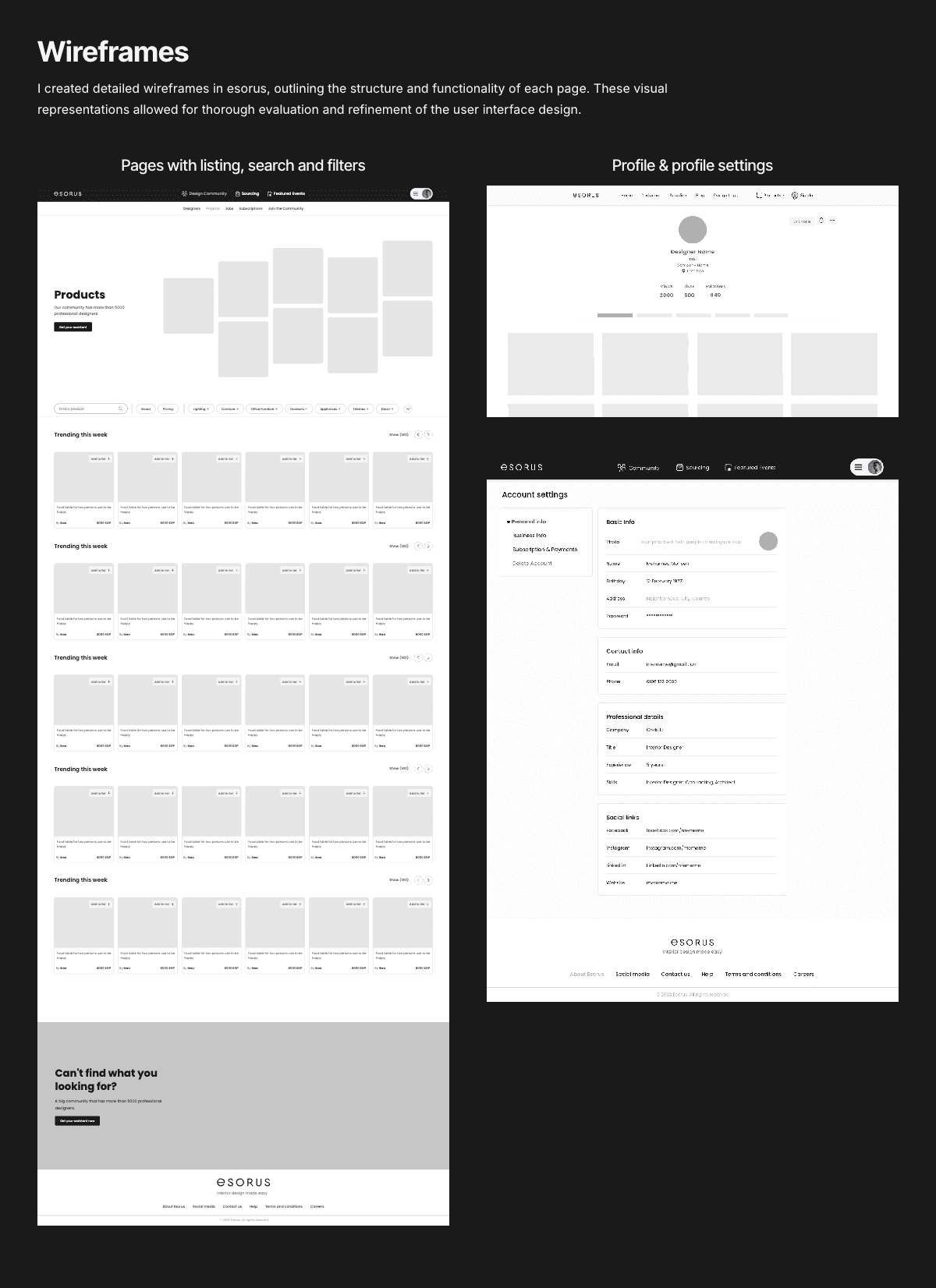 Esorus is a digital platform that connects interior designers with suppliers, products, and collaboration tools. I contributed as a Product Designer, focusing on UX strategy, research, wireframes, and UI design. My goal was to craft a simple, professional platform that empowers designers to stay up-to-date with industry trends and access discounted products.